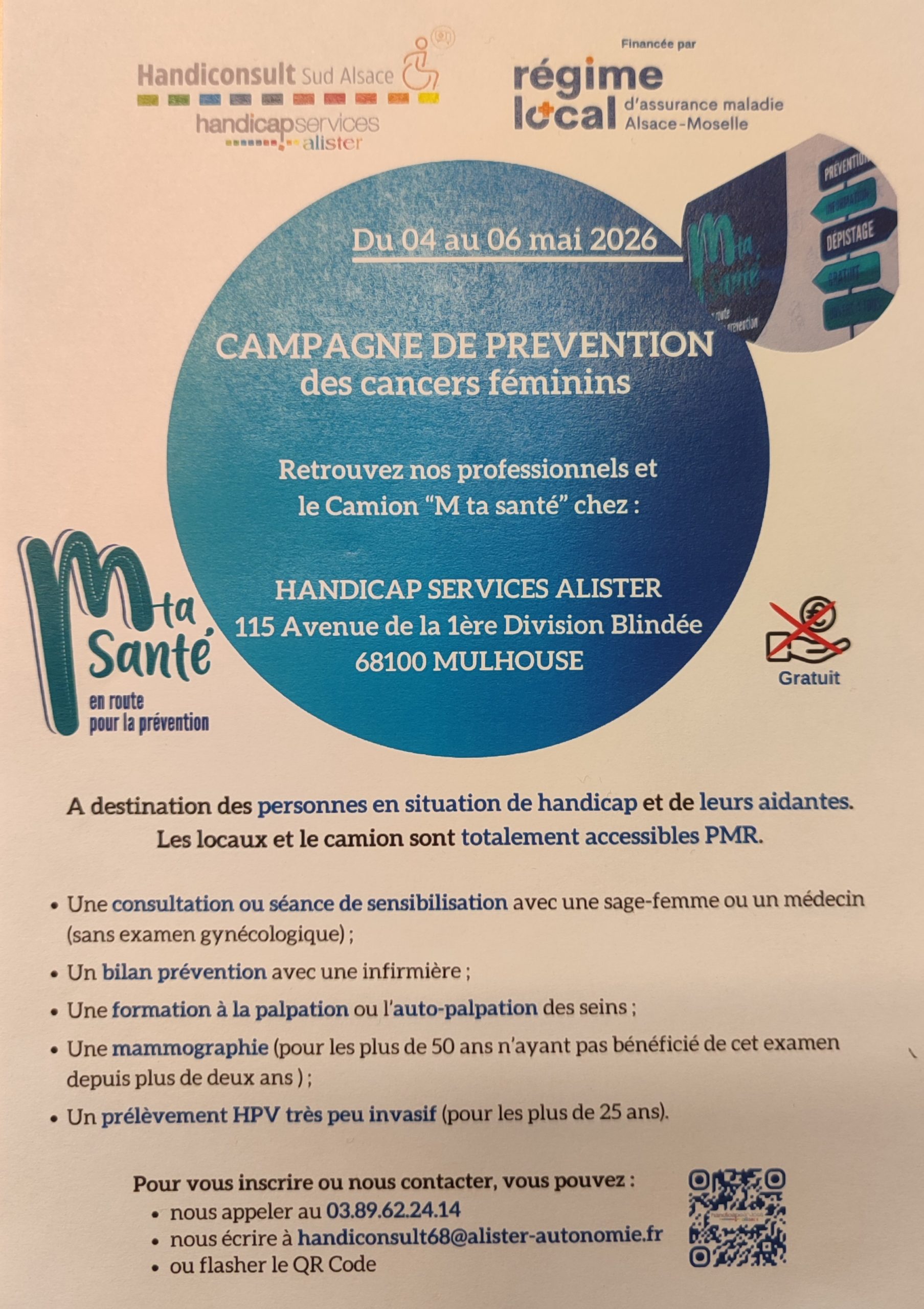 Du 04 au 06 mai 2026 , le camion sera dédié aux femmes en situation de handicap, aux aidantes et aux professionnelles qui souhaitent accéder à une consultation et des examens de dépistage des cancers féminins.